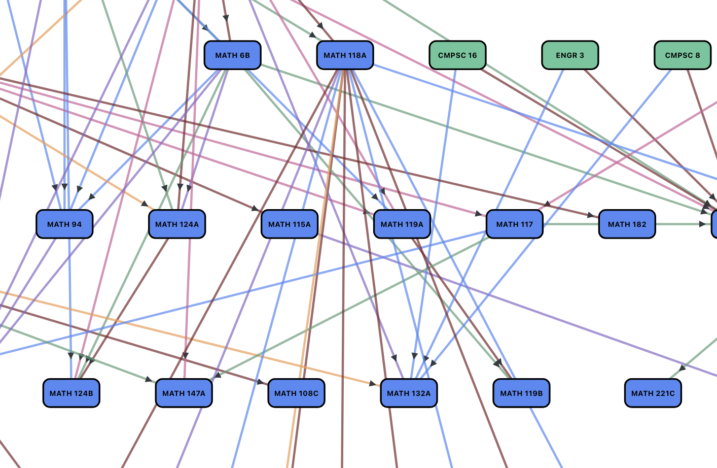 Jan - Nov 2023courses_graph is a Vue site representing all courses at UCSB as a dependency DAG, after scraping all available data from school websites and its API. We dynamically displayed course data using a constrained optimization library and d3, with Quasar components. This project won 3rd place at the 2023 Coders SB Project Showcase, earning us $250.